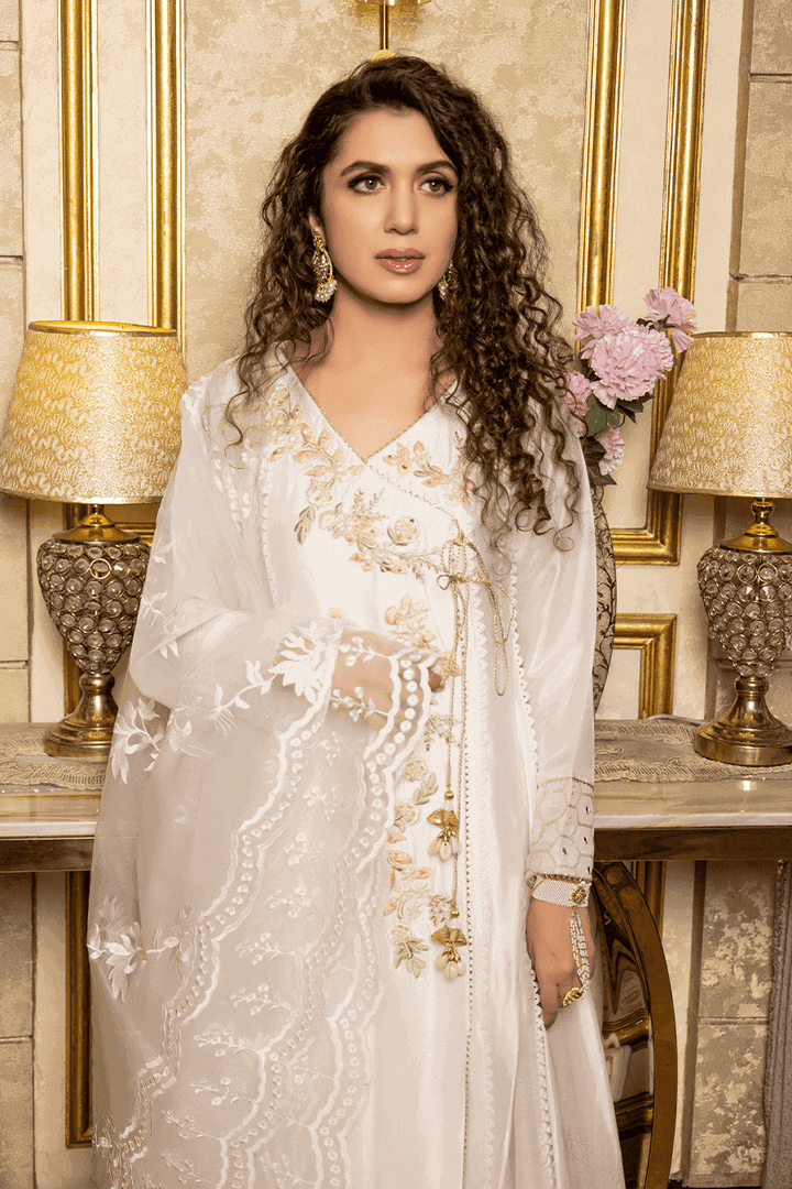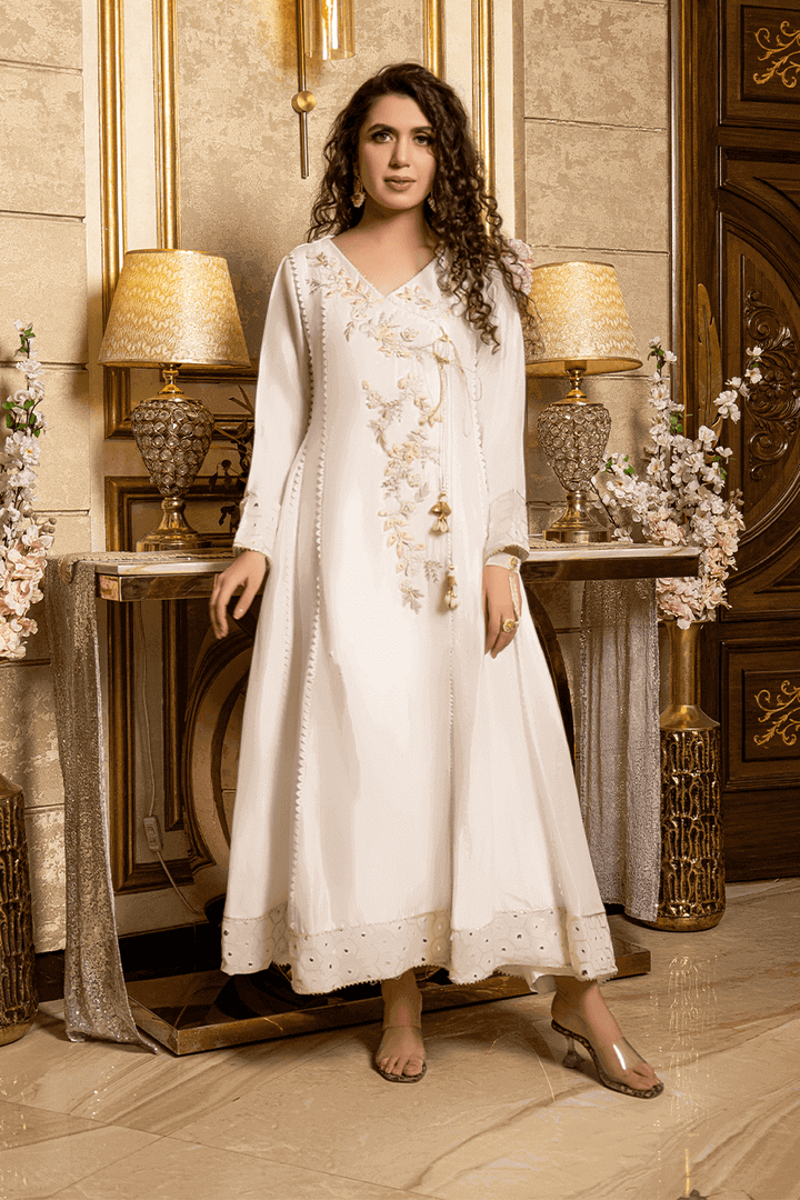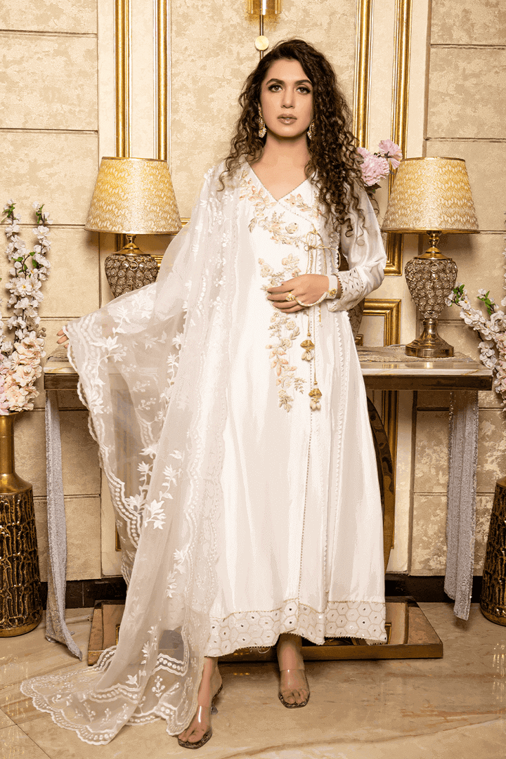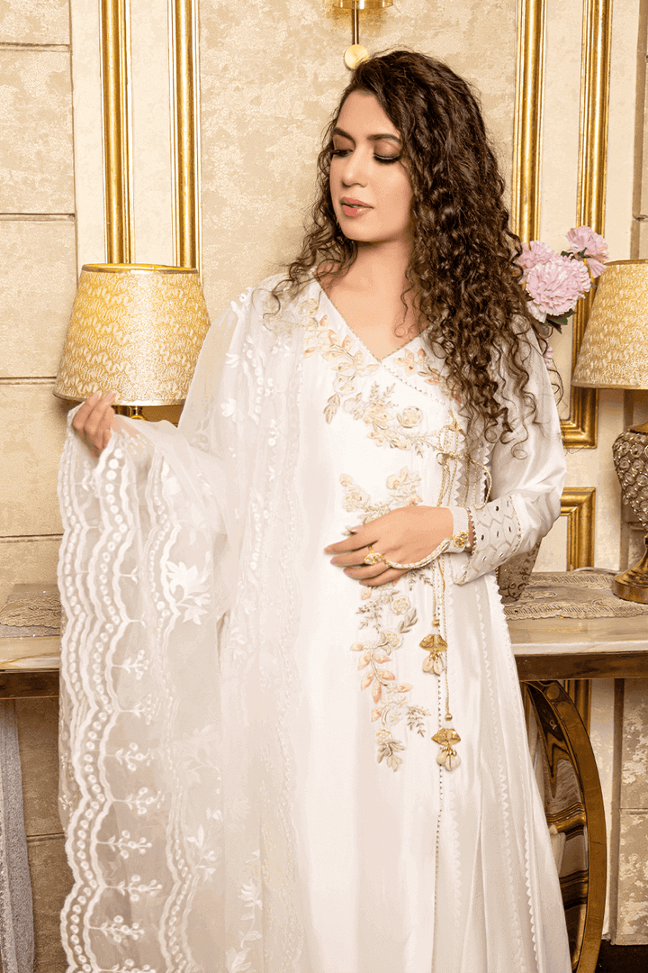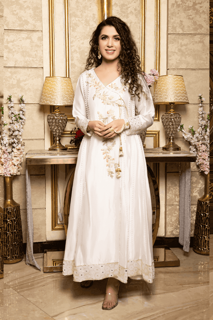 Embrace timeless elegance in this pearl white silk dress. Adorned with intricate resham work, pearls, and sequins, it radiates understated glamour. A classic choice that adds a touch of sophistication to your wardrobe