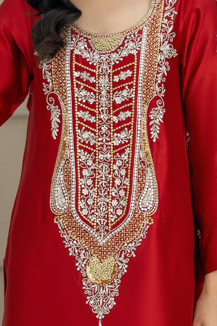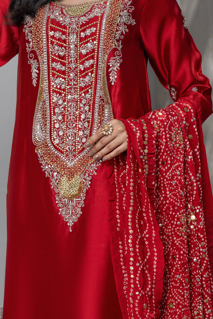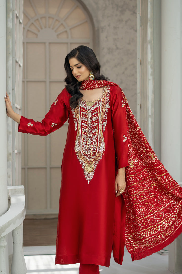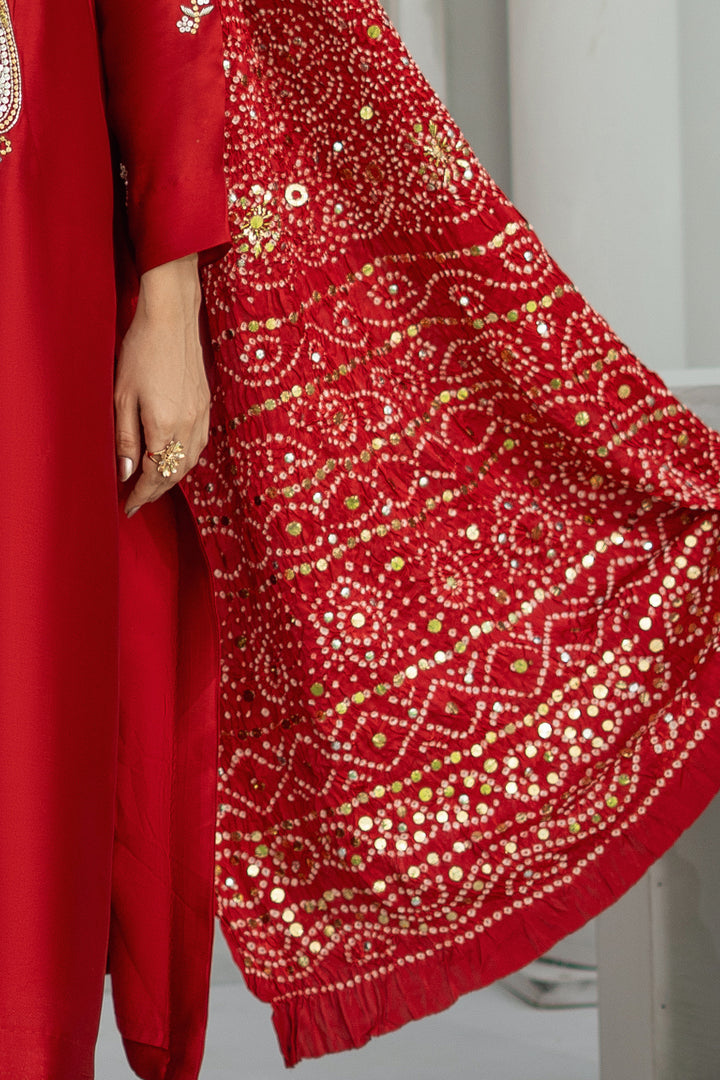 A timeless statement of grandeur, Laal-e-Ibteda embodies regal charm in every detail. Crafted from pure shisha silk, this deep crimson ensemble is adorned with exquisite handwork — a rich composition of intricate embroidery and embellishments that exude royal finesse. The look can be elevated with a bandhni dupatta detailed with Mukesh work, kissed with heritage artistry — or paired with a plain or sequin-sprayed dupatta for a subtler touch. Dupattas are sold separately, allowing you to personalize the look to your own style.