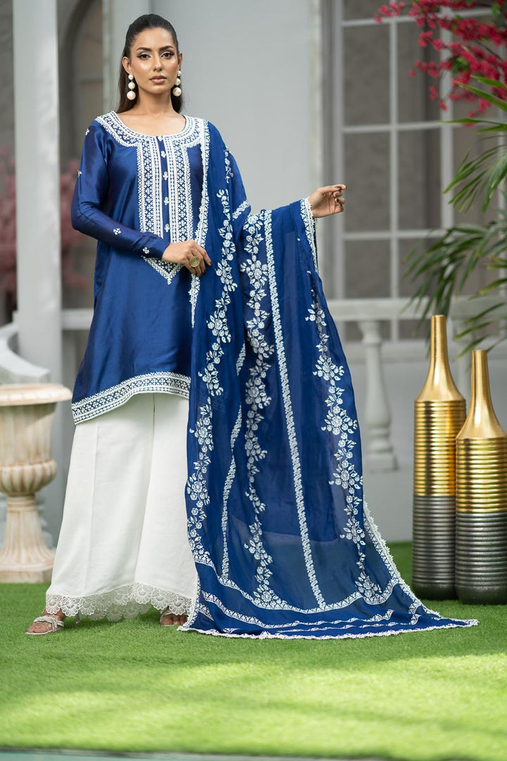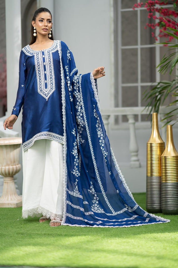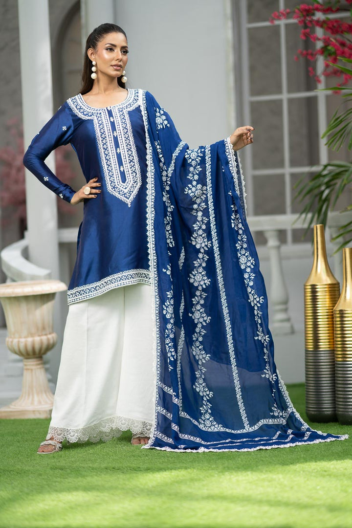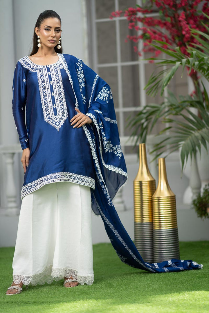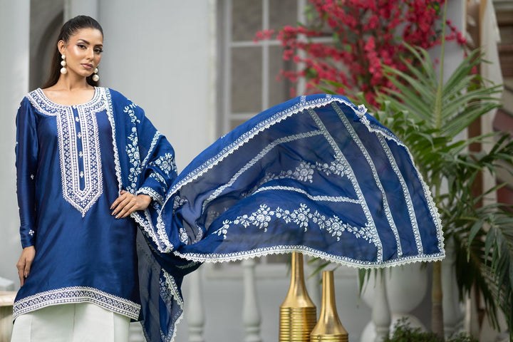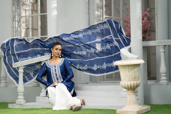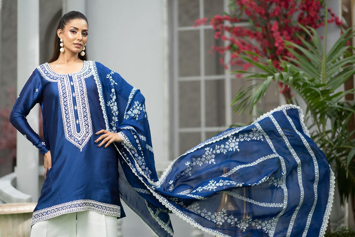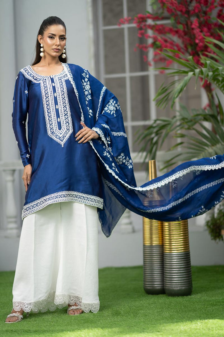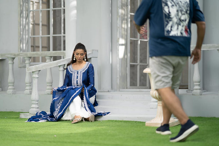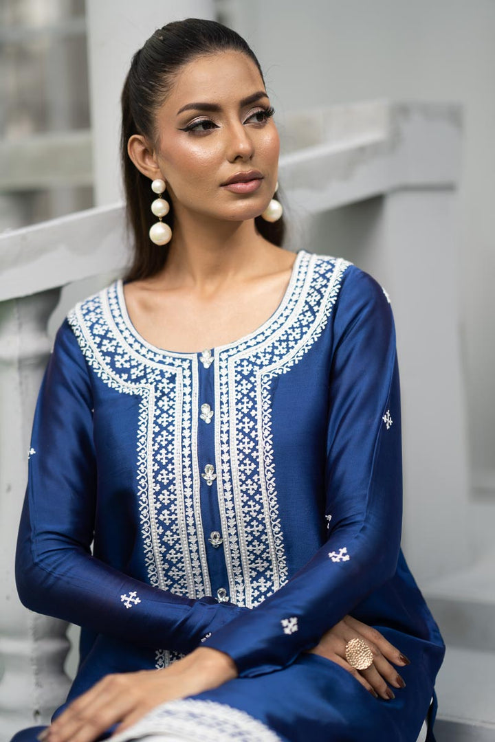 Ethereal and composed, Neelofar captures the calm strength of the modern muse. The pure shisha silk shirt features intricate aari and pearl work, paired elegantly with wide-legged trousers adorned with an embroidered lace border. The ensemble can be completed with a medium silk screen-printed dupatta, kissed with delicate patterns — available separately for a refined finishing touch. A seamless balance of sophistication and ease, Neelofar is an ode to understated luxury.